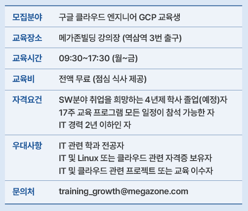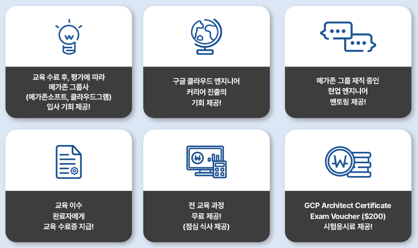 구글 클라우드 기반 클라우드 아키텍쳐 설계 및 운영자 양성을 위해 구글 클라우드 공인 교육 과정을 전액 무료로 제공하며 동시에 GCP 자격증 시험 통과자들을 대상으로 메가존 그룹사 (메가존소프트, 클라우드그램) 입사 기회까지 제공합니다. 메가존 그룹 재직 중인 협업 엔지니어 멘토와 함께 프로젝트를 수행하며 구글 클라우드 엔지니어 커리어 진출의 기회를 얻을 수 있습니다.