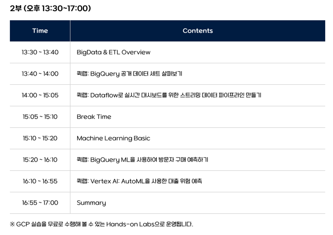 특히, 1부에서는 Google Cloud 서비스에 액세스하고 관련 서비스를 관리할 수 있는 브라우저 기반 UI Cloud Console을 직접 다뤄볼 예정이며, 2부에서는 실습을 통해 GCP BigQuery와 Dataflow의 주요 기능을 파악하는 내용으로 준비되었습니다