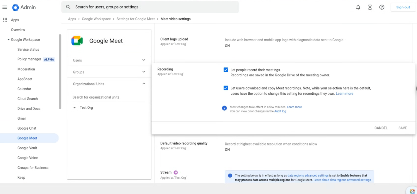 - 관리자는 도메인, OU 또는 그룹 수준에서 새롭게 추가된 ‘Meet 비디오 설정 > 사용자가 Meet 녹화본을 다운로드하고 복사하도록 허용’ 설정을 통해 이 기능을 관리할 수 있습니다. 기본 설정은 사용자가 Meet 녹화본을 다운로드하고 복사할 수 있도록 허용하는 것입니다. 관리자는 언제든지 이 기본 설정을 변경할 수 있습니다.