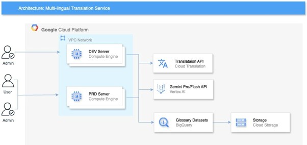 다국어 번역 서비스는 사용자별 전문 게임 번역을 제공하는 서비스입니다. 이 서비스는 Google Gemini API와 Translation API를 기반으로 실시간 번역을 수행하며, 게임 특화 용어집은 BigQuery를 통해 실시간으로 검토됩니다. 사용자 인증과 활동 로그는 Google Cloud Storage와 BigQuery에 저장되어, 사용자별 접근 제어와 로그 기반 통계 기능을 제공합니다. 번역 서비스는 Compute Engine VM에 배포되어 안정적으로 운영되고 있습니다.