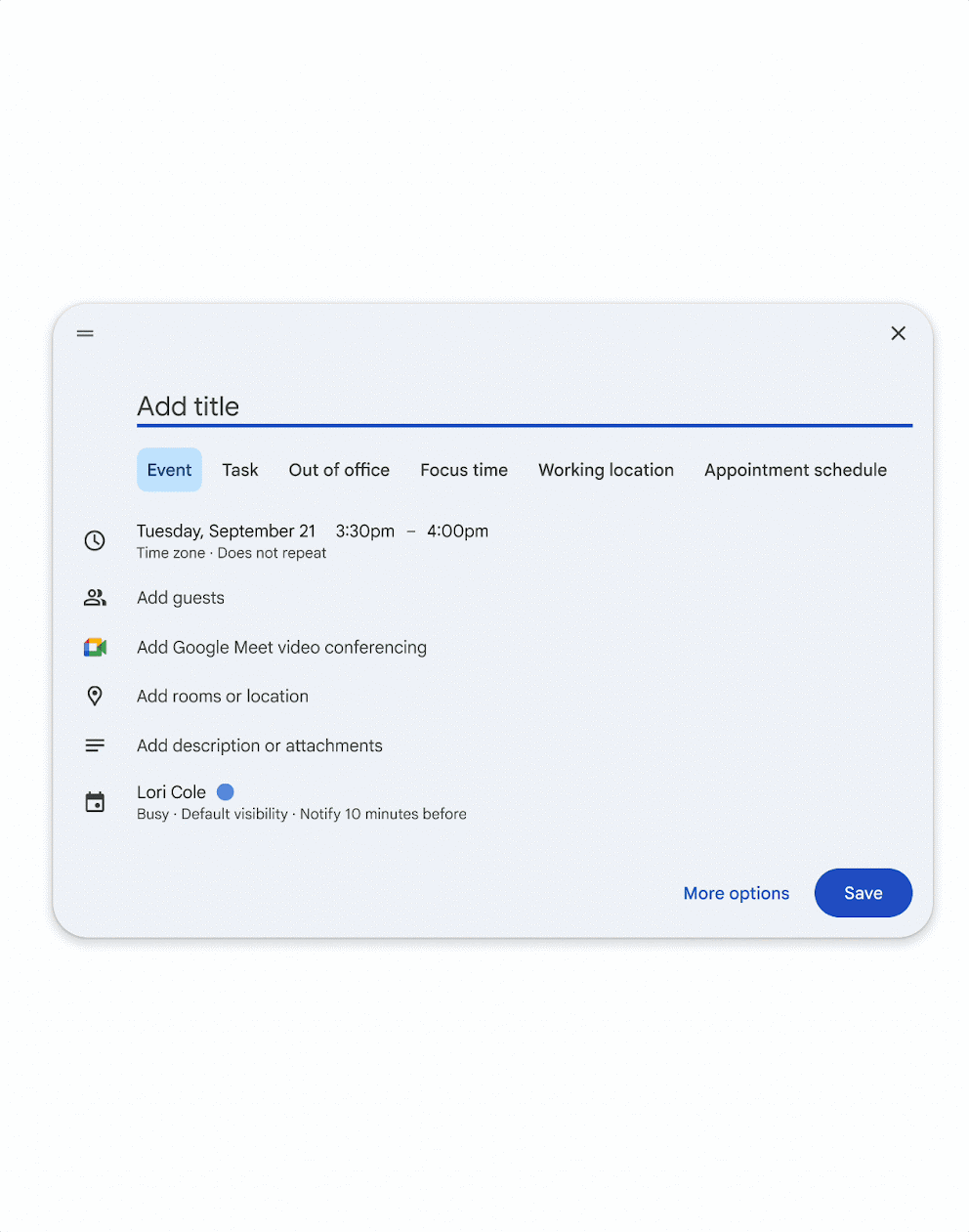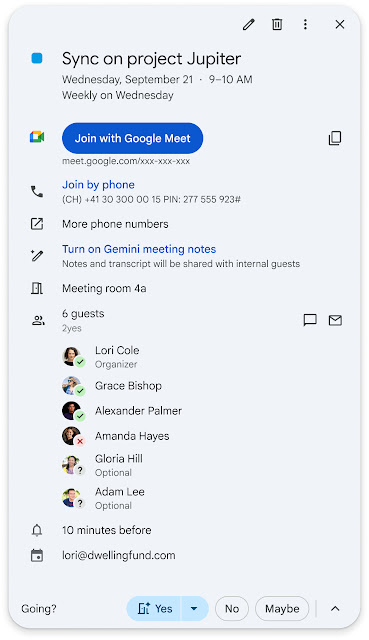 Gemini가 메모를 더 쉽게 작성할 수 있도록 개선했습니다. 이제 이벤트 주최자는 캘린더에서 이벤트 일정을 예약하거나 회의를 준비할 때 ‘메모 작성’ 기능을 활성화할 수 있습니다.