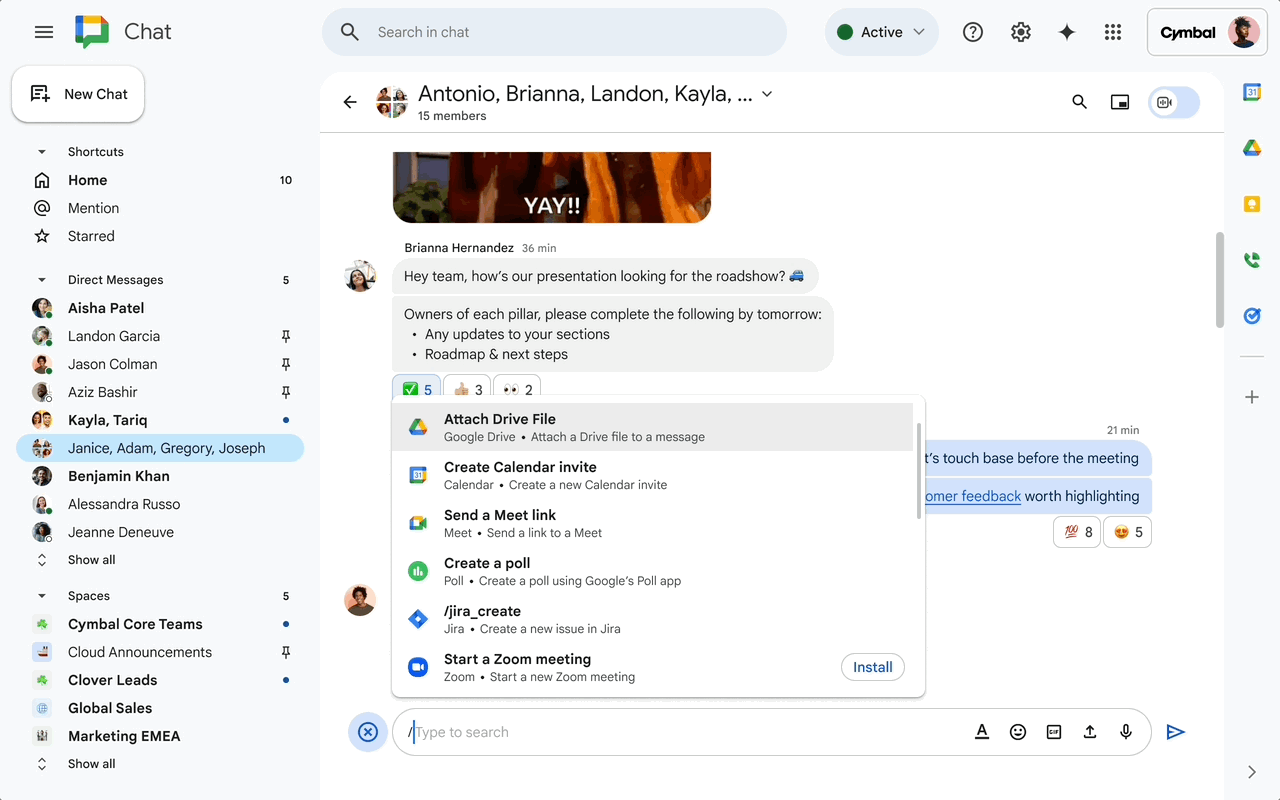 새롭게 디자인된 통합 메뉴를 통해 Google Chat에서 즐겨 사용하는 앱과 작업을 더 빠르고 쉽게 찾아 사용할 수 있도록 개선되었습니다. 이제 새롭게 개편된 통합 메뉴를 통해 더 적은 클릭으로 앱을 검색하고 명령을 실행할 수 있습니다. 메뉴는 작성 창 옆의 “+” 버튼을 클릭하거나 “/”를 입력하여 이용할 수 있습니다. 예를 들어, “/poll”을 입력하면 Poll 앱으로 바로 투표를 생성할 수 있고, “+” 버튼을 눌러 Calendar 초대 생성, Drive 파일 업로드, Meet 링크 전송 등 다양한 옵션을 손쉽게 실행할 수 있습니다.