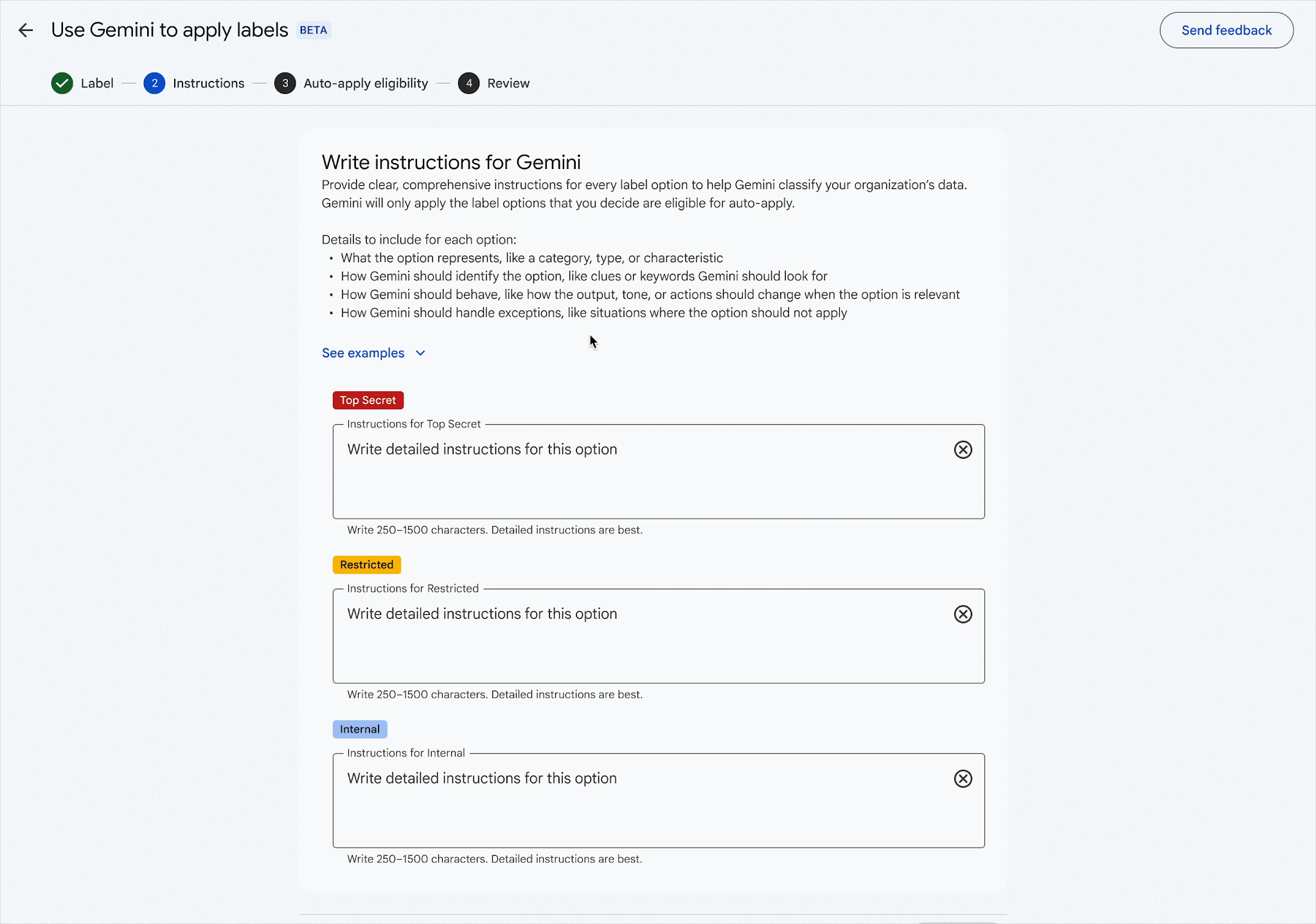관리자는 모든 권한을 보유합니다. 라벨을 선택하고, 프롬프트를 통해 지침을 제공하며, 파일을 평가할 대상의 범위를 정합니다. 감사 로그는 파일에 라벨이 지정되거나 사용자가 Gemini에서 적용된 라벨을 승인 또는 수정하는 시점을 기록합니다.