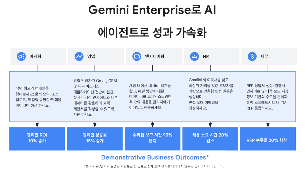Gemini Enterprise는 Google Cloud의 고급 에이전트형 AI 플랫폼으로 기업 데이터 검색·분석·자동화와 맞춤형 AI 에이전트 생성을 단일 인터페이스에서 제공하는 엔터프라이즈급 솔루션입니다.