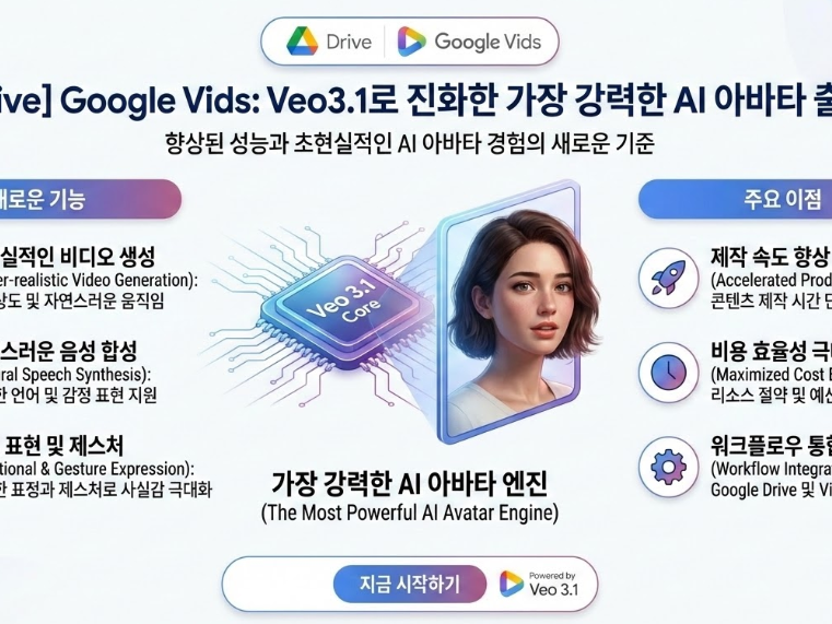 📌 지원되는 버전 : Google Workspace Business Starter 이상 참고 : Google Workspace Business Starter, Enterprise Starter는 2026년 5월 31일까지 생성형 AI 기능 이용 가능 올해 초 비디오 제작을 간소화하기 위해 Google Vids에 AI 아바타 기능을 출시한 데 이어, 오늘부터 Google의 최첨단 비디오 생성 모델인 Veo 3.1을 탑재한 한층 업그레이드된 아바타를 이용할 수 있습니다. 이번…