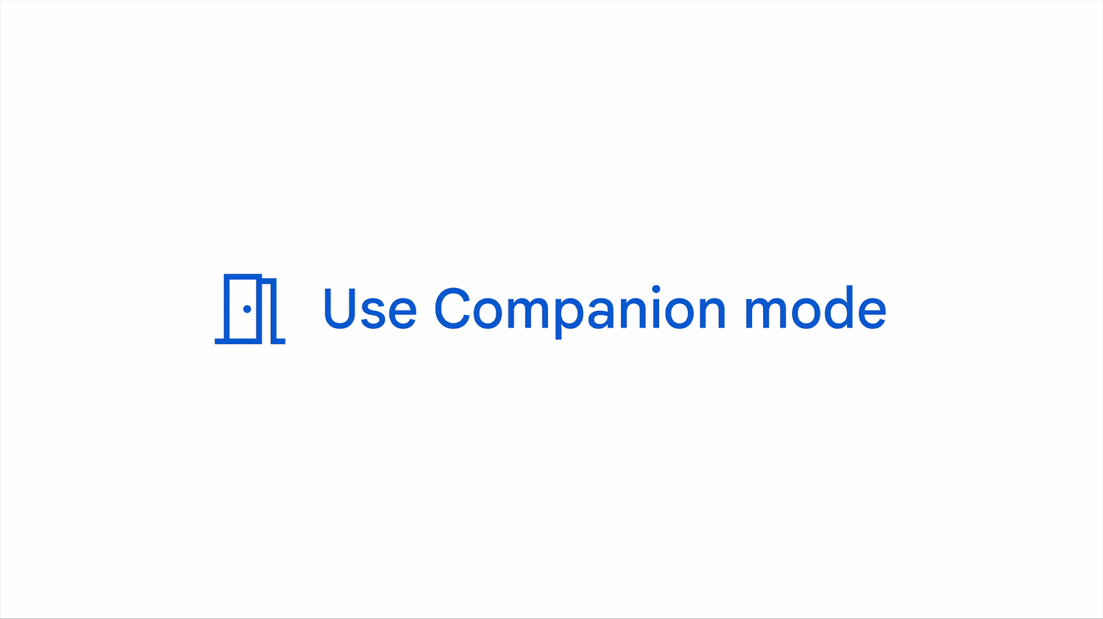 노트북에서 Google Meet 그린 룸(Green Room)을 열면, 자동으로 회의실을 감지하고 연결할 수 있는 간단한 옵션을 제시합니다. 단 한 번의 클릭으로 회의실 하드웨어에서 회의가 시작되고, 노트북은 컴패니언 모드(Companion mode)로 전환되어 회의에 접속한 상태로 끊김 없이 협업할 수 있습니다.