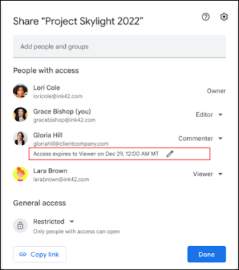 이제 공유 드라이브에서 파일을 공유할 때 만료일을 설정할 수 있습니다. 이를 통해 임시 공동작업자를 위해 공유 대화 상자에서 바로 만료일을 추가할 수 있으며, 액세스가 자동으로 취소되어 수동으로 정리할 필요가 없어집니다.