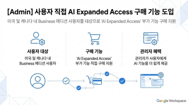 📌 지원되는 버전 : 미국, 캐나다 지역의 Business Standard, Business Plus 최신 AI 도구에 대한 수요가 급증함에 따라, IT 관리자를 거치지 않고도 사용자가 직접 Google Workspace 부가 기능을 구매할 수 있는 새로운 시스템을 도입합니다. 첫 단계로 미국 및 캐나다 내 Business 에디션 사용자를 대상으로 ‘AI Expanded Access’ 부가 기능 구매가 지원됩니다. 기존에는 Gemini 앱, NotebookLM의…